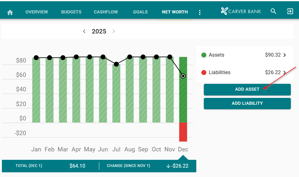 - Select Add Asset or Add Liavility, depending on the type of account you want to include.
